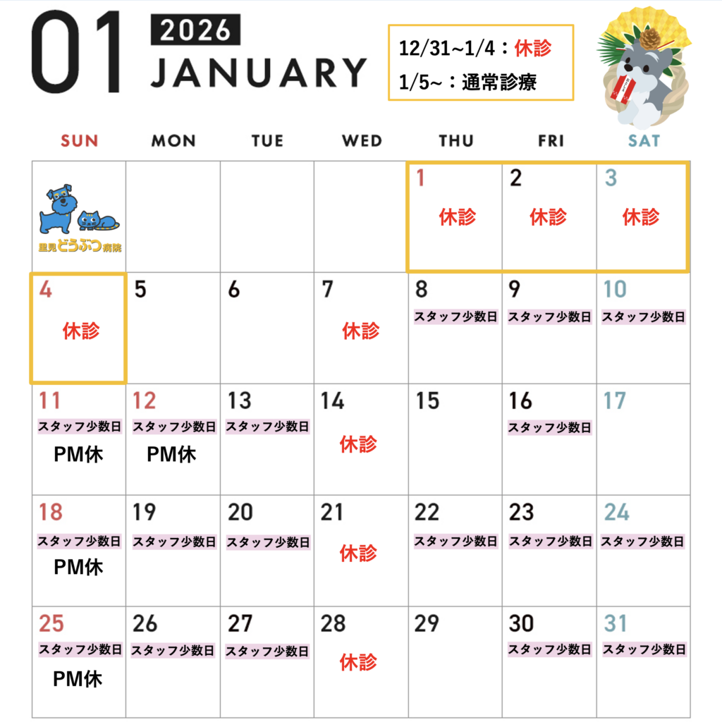 2026年1月より診療体制が変更となるため、スタッフ人数が限られた日が多くなります。