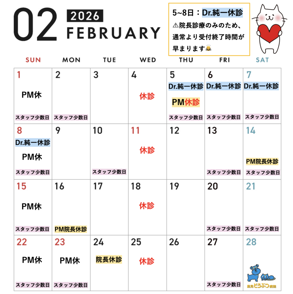 診療カレンダーに「スタッフ少数日」を記載しておりますので、ご来院前にカレンダーの確認をお願いいたします。